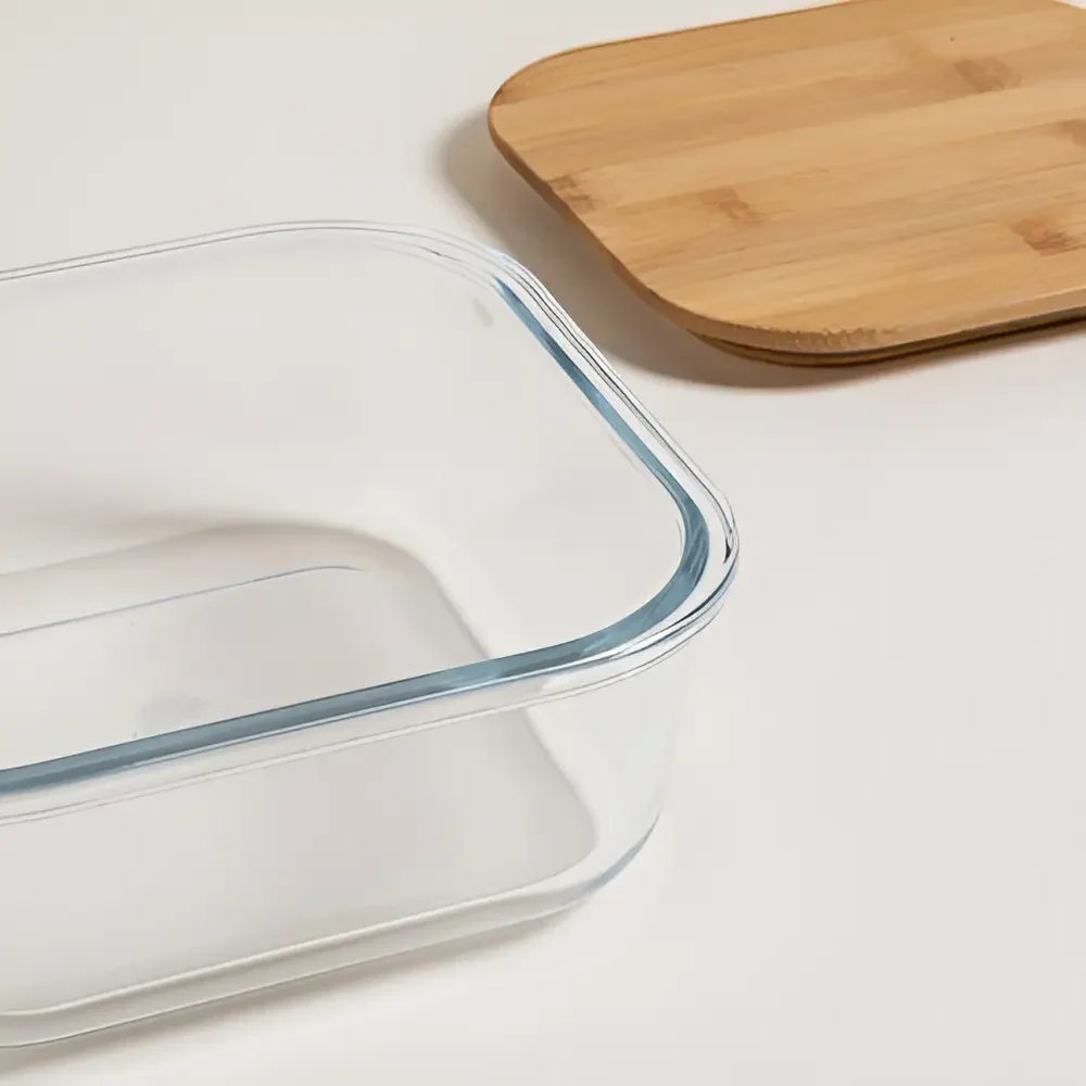 El vidrio es apto para microondas y horno, pero la tapa de bambú no lo es.