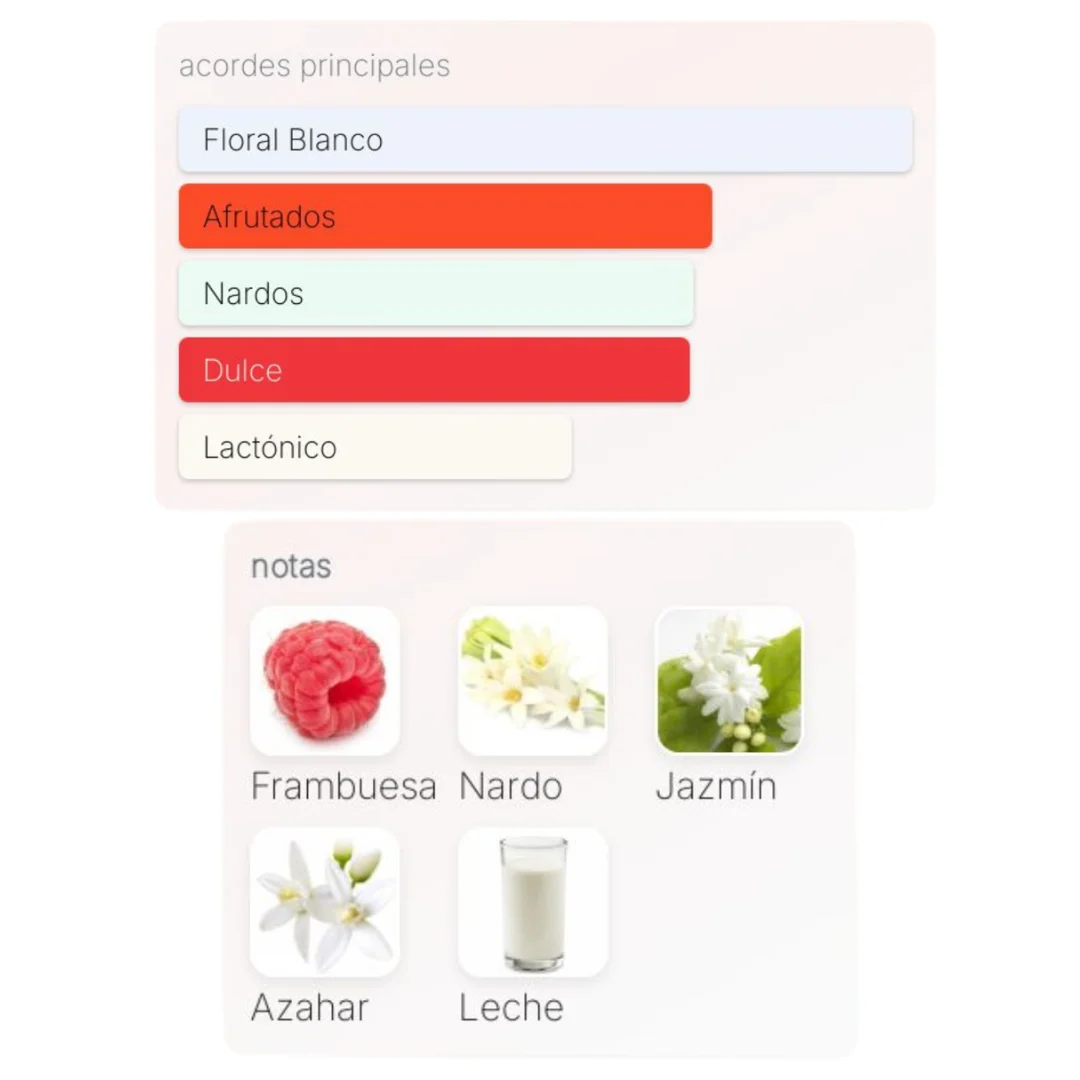 Una fragancia femenina dulce y cremosa con un toque irresistible de frambuesa. Combina flores blancas con un fondo suave y adictivo, logrando un perfume moderno, sensual y perfecto para destacarse. De la familia floral frutal, con un aroma dulce, cremoso y ultra femenino que combina frutas rojas con flores blancas intensas.